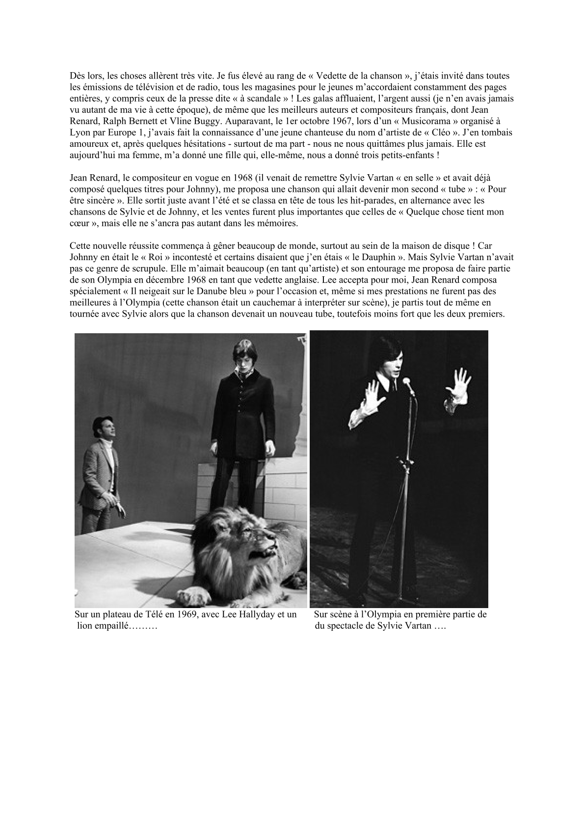 Depuis tout petit, je suis un solitaire, d'un tempérament plutôt secret. Pas vraiment dans la " communication ". Pas très show-biz, pour tout dire. Des personnes comme Lee Hallyday ou Vline Buggy se sont arrangées pour qu'il veuille bien de moi, ce show-biz mirifique. Je les en remercie, je n'y serais peut-être pas allé tout seul. En vrai Alsacien, je suis tout d'un bloc. Mais vient un temps où le bloc se fissure. Les mots, faut bien qu'ils sortent. Il me faut bien livrer ce qu'il y a à livrer... mon père éboueur, la chanson, maîtresse fantasque qui m'a trahi après Quelque chose en moi tient mon coeur, pour revenir me combler avec Pour le plaisir, ce succès phénoménal qui a marqué ma vie d'homme et d'artiste... Il me faut livrer mes deuils insurmontables, mon bonheur avec la même femme depuis plus de quarante ans, ma réputation usurpée ? - de chanteur torride... Livrer ma passion pour les avions russes et le football, que je pratiquais hier encore... et livrer tout le reste... les accidents de ma route, la chance qui se fait payer cash, les stars côtoyées dans leur vérité nue, une fois soufflée la poussière de gloire...